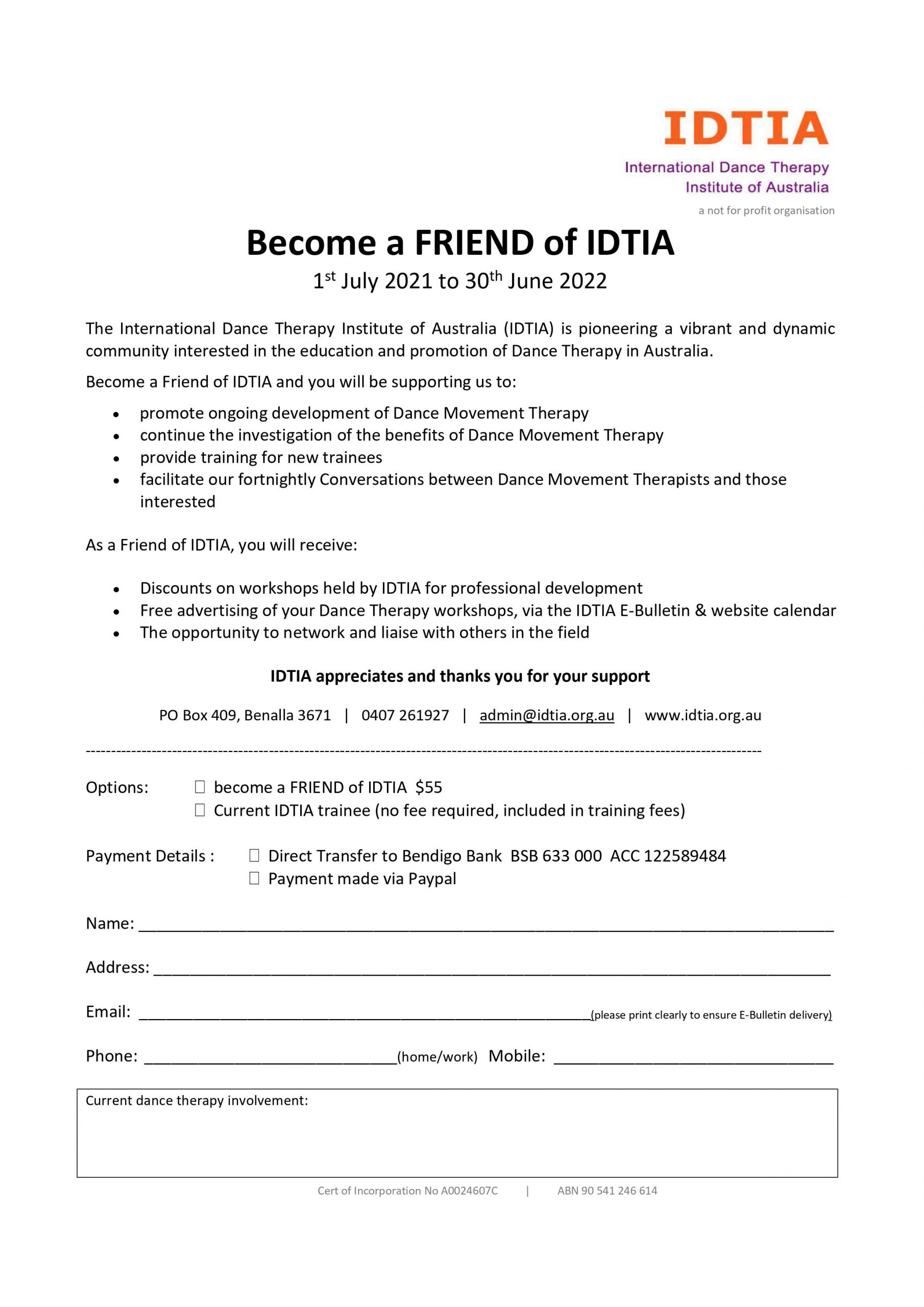 - Free advertising of your Dance Therapy workshops, via the IDTIA E-Bulletin & website calendar